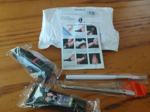 Llego completo, tardo un mes y medio. Las uñas son un poco gruesas, vienen 20 uñas. Probablemente no alcance para hacerse las uñas en las dos manos. Pero es bueno para iniciar y probar.